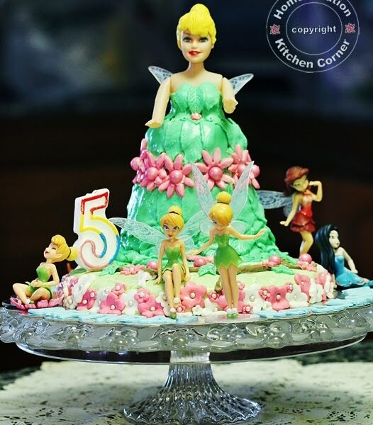 Liana made a request for her birthday cake months ago that she wanted a Tinkerbell cake with leafy gown. We just returned from our long distance trip which was few days before her birthday. I had time only on her birthday itself to look for a Tinkerbell doll but to no success and instead found the tiny ones. So I had to modify an ordinary doll into a Tinkerbell by replacing her hair with yellow fondant…. As for the cake, it was an easy choice as Liana always like pink cake. So I made a four-tone pink cake and happy with the outcome.